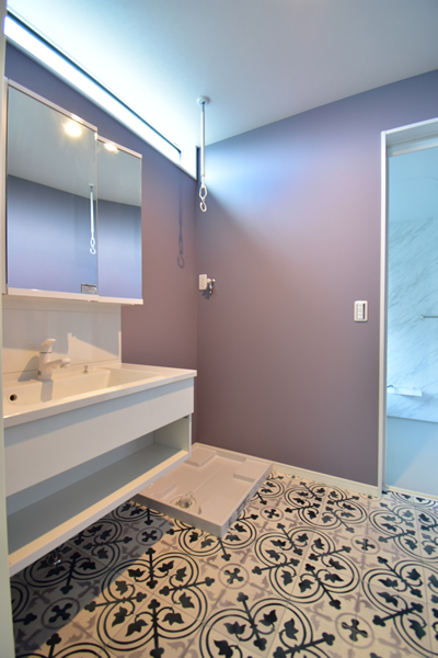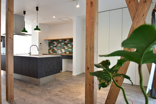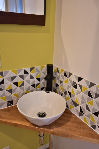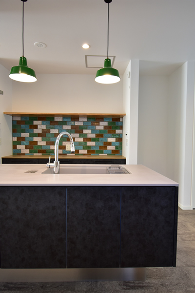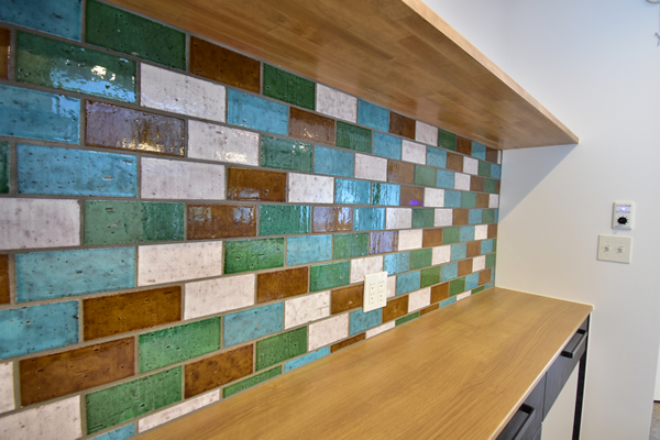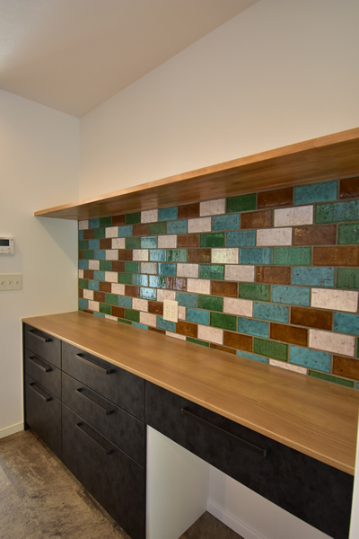 元気なカラーがお好きな奥様へ、カラフルだけどシックで落ち着いた色合いのタイル使いをキッチンと玄関手洗いスペースにご提案いたしました。インテリアの効果的なアクセントとして喜んでいただけたかと思います。