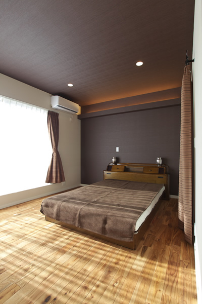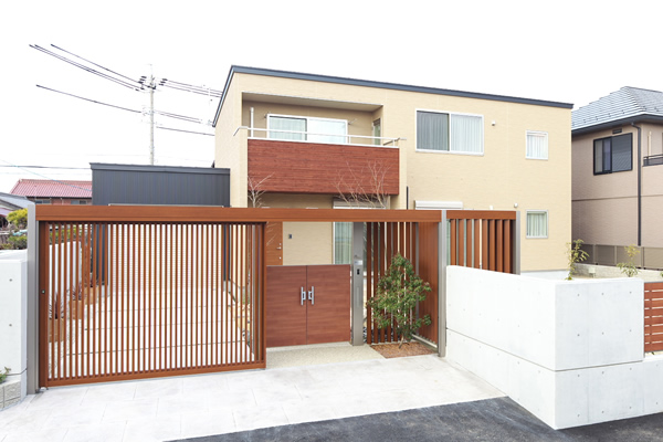 外観はシンプルな形状の住宅に、スリット入りの木製ゲートと打ち放しコンクリート塀が上品な風格をプラスしています。